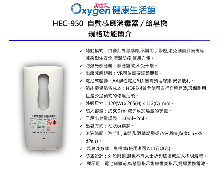 【奧世潔】HEC-950自動感應乾洗手消毒機/給皂機-滴狀皂管(給皂用)